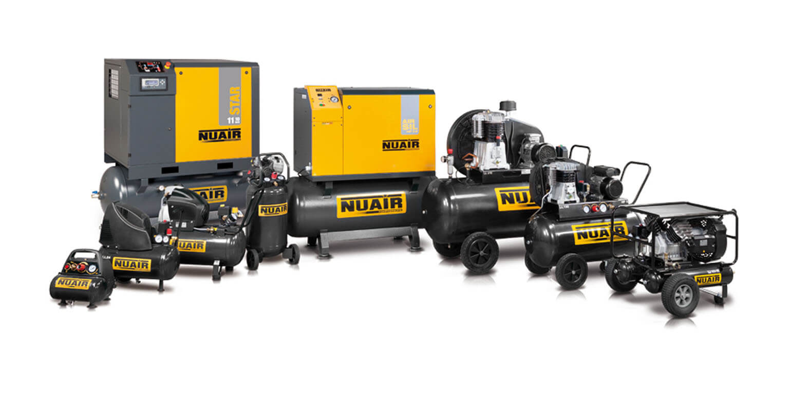 NUAIR (ITALY) - AIR COMPRESSORS - Industrial Air compressors from 50 ltr to 900 ltr tank capacity - Single and Three phase models with double head option - Upto 10 HP capacity - Pressure max 11 bar and flow max 2460 lpm - Read More